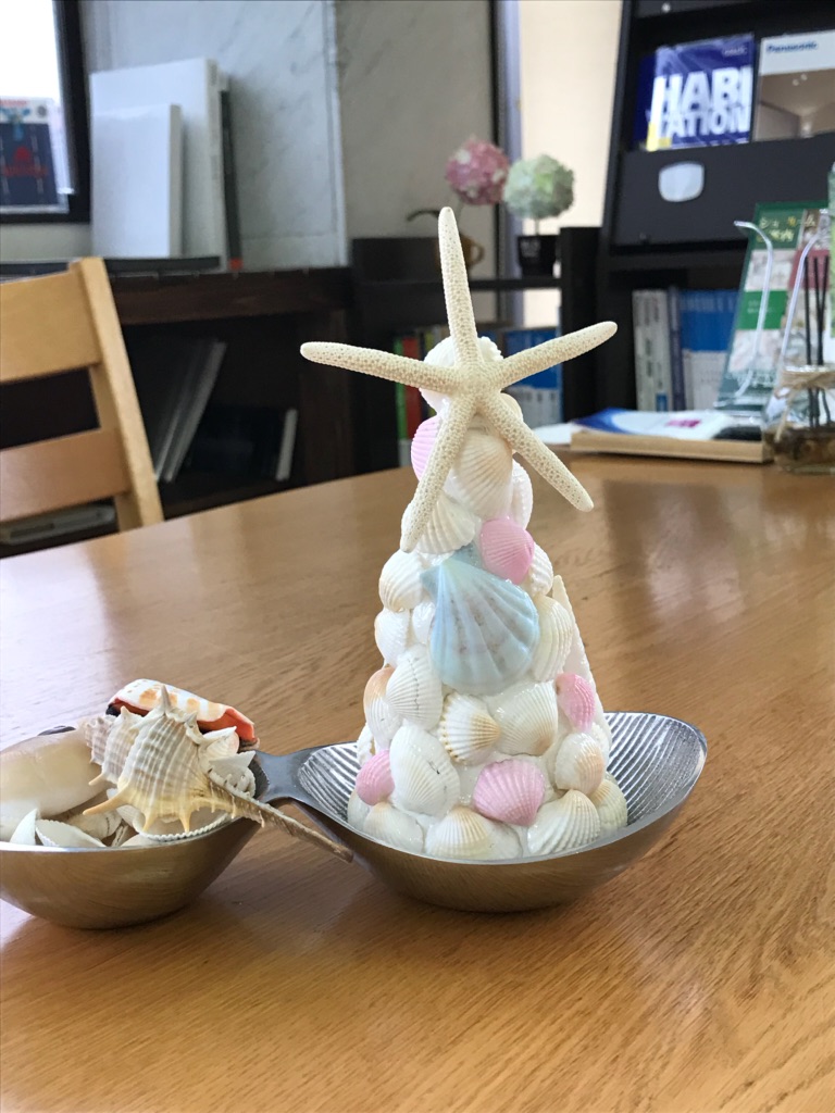 スタッフ手作りのシェルツリーも飾り、夏仕様の店内になっています